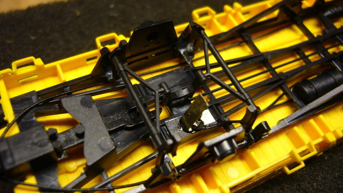 Le loco tracteur Robel est traité à l'identique. Le raccordement des deux fils conducteurs se fait sur les lamelles de contact bien visibles sous le châssis