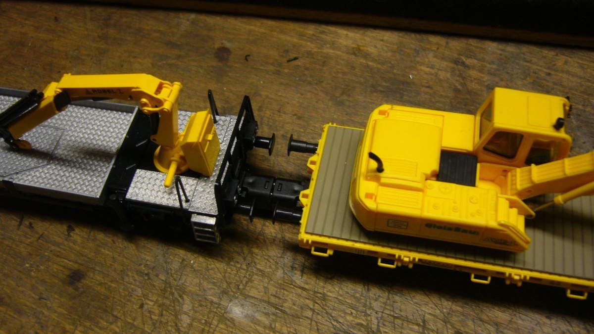 J'ai ajouté des feux de fin de convoi sur le wagon porte pelleteuse, une fois accouplé, le contact électrique loco/wagon est nettement amélioré et permet de franchir sans à coup toutes les zones délicates d'aiguillages. Ce dispositif est recommandé pour tous les engins moteurs à deux essieux ou à faible empattement.