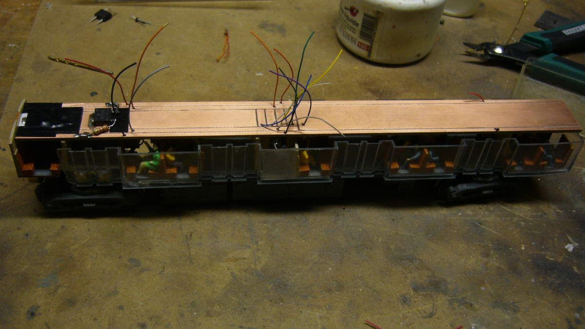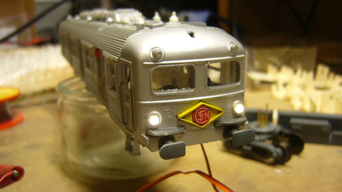 La motrice de tête et de queue est équipée de leds canon bicolores montées en parallèle avec une résistance de 5 Kohms sur chaque cathode. Un fil limande à trois conducteurs chemine sous la toiture où il sera raccordé au décodeur