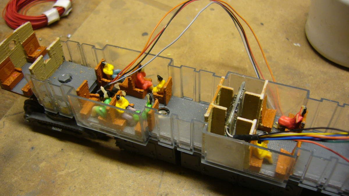 Les aménagements sont ensuite collés sur le châssis Jouef, après la pose de voyageurs. Le compartiment toilettes est occulté avec un papier canson opaque, ce qui permettra de cacher le décodeur que je vais installer dans cet espace