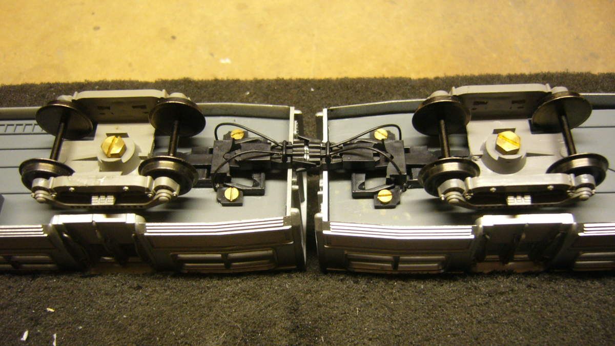 La conception des caisses Budd permet d'installer des timons d'attelages à élongation variable Roco. Ils seront vissés et collés sous les caisses respectives.