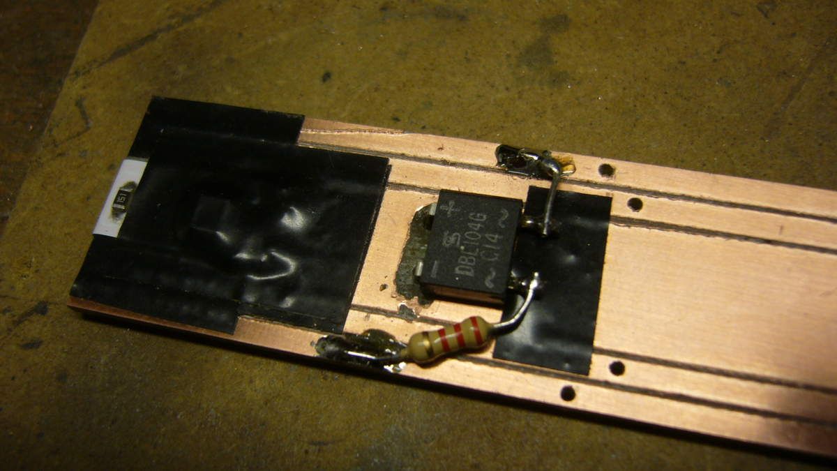 j'ai ajouté un mini pont redresseur pour alimenter en continu le ruban de leds CMS en veillant à isoler les points de soudure sur chaque piste. En façade, j'ai également prévu un éclairage cabine conducteur qui sera programmable avec la touche Aux F1 de la centrale digitale.